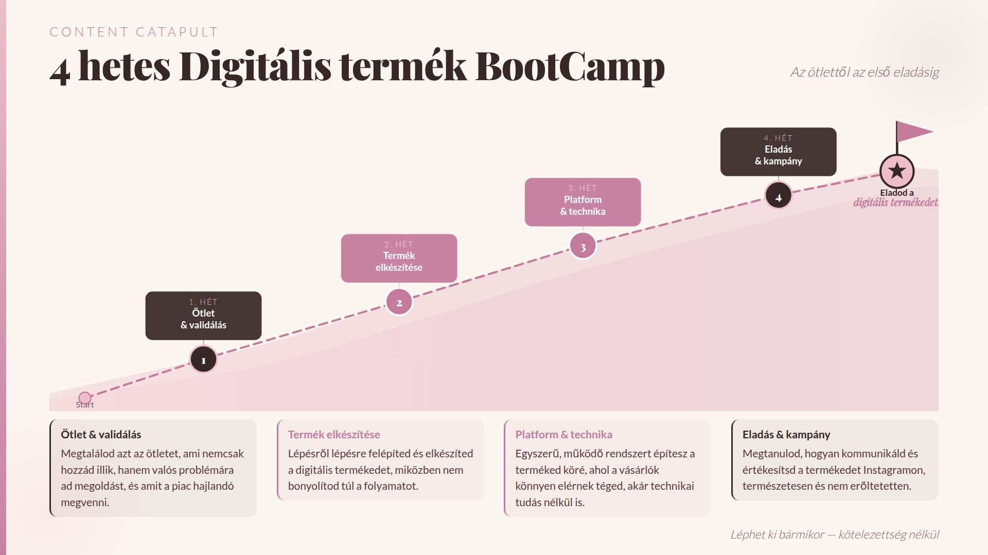 Ezen a 4 hetes, gyakorlatias bootcampen lépésről lépésre végigvezetlek azon a folyamaton, amivel az ötletedből saját digitális terméket készítesz és elindulhatsz a digitális terméked értékesítésében is.